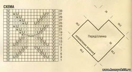 Ажурный мотив (ширина 18 петель): вязать по схеме, на которой приведены только лиц. ряды, в изн. рядах петли вязать по рисунку или как обозначено, накиды вязать изн. Повторить 1 раз с 1-го по 34-й ряды. $CUT$