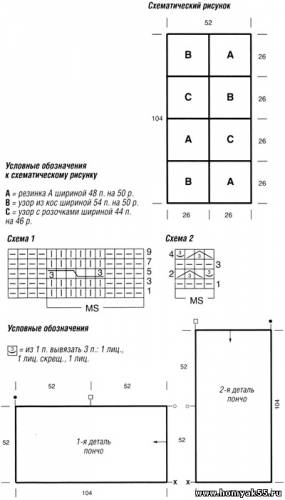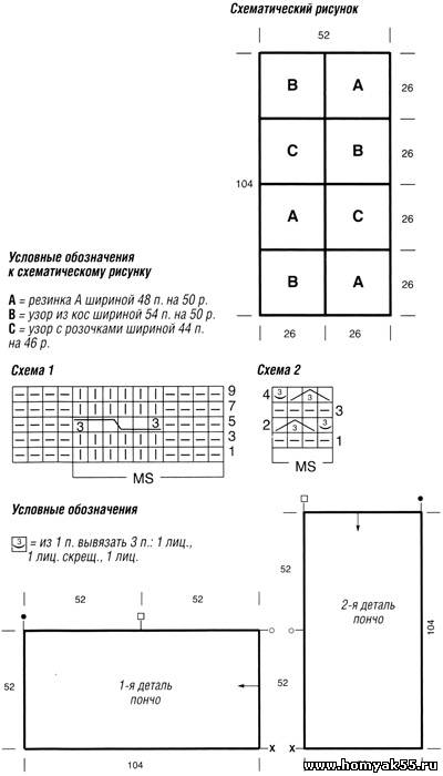 Внимание! Пончо вязать из двух одинаковых деталей. Стрелки на выкройке = направление вязания. Узоры имеют различное число петель. Петли к началу узора следует соответственно прибавлять или убавлять. Распределение узоров выполнять по схематическому рисунку. Узор с розочками = 46 рядов, остальные узоры = по 50 рядов соответственно, для этого 2 раза в каждом 18-м ряду внутри раппорта в высоту вязать укороченные ряды.