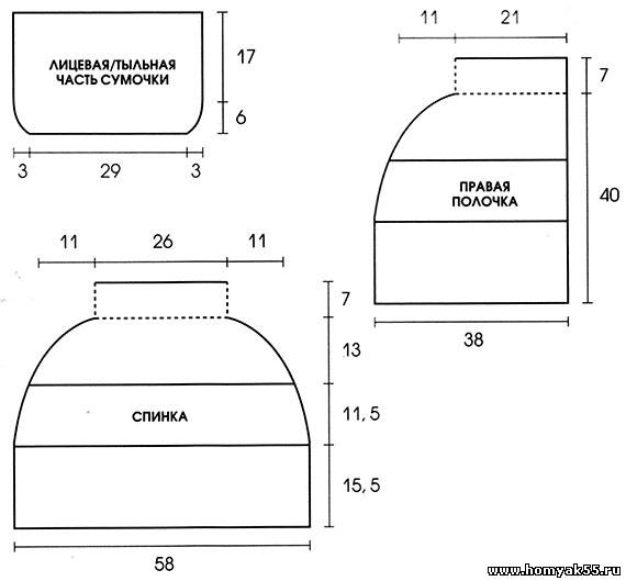 Выполнить плечевые швы. Для воротника на спицы № 5,5 набрать все отложенные петли и вязать особым узором. Через 3 см выполнить справа 2 отверстия для пуговиц: первое после первых 4 петель, второе на расстоянии 18 петель от первого. Через 7 см от наборного края связать 4 ряда двойной резинкой и закрыть все петли трикотажным швом; пришить пуговицы.Сумочка спицами