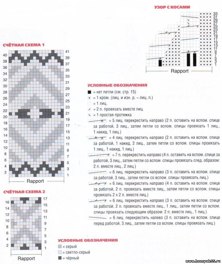 Узор с косами: вязать по схеме, на которой приведены нечётные круг. ряды. В остальных круг. рядах петли вязать по рисунку.