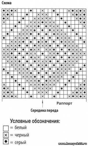 На спицы № 7,5 наберите (133) 145 (157) петли белой нитью, провяжите 1 ряд с изн. стороны следующим образом: кром. петля, * 1 изн. петля, 1 лиц. петля *, повторяйте *-*, закончите 1 изн. петлёй, кром. петля. Затем поменяйте спицы на № 6 и вяжите прямыми и обратными рядами 12 см английской резинкой, провязывая по краям кром. петли. В последнем ряду выполните метки следующим образом: вяжите (22) 24 (26) петли, выполните метку, вяжите (66) 72 (78) петель, выполните метку (левая сторона), вяжите (45) 49 (53) петель. Обрежьте нить.Затем на круговые спицы № 6 наберите по краю петли. Вяжите вкруговую лиц. гладью, равномерно прибавляя в первом ряду (32) 37 (43) петли на передней части и (33) 38 (42) петли на спинке = (198) 220 (242) петель. Далее вяжите орнамент по схеме. После орнамента вяжите белой нитью, равномерно изменяя количество петель в первом ряду до (198) 222 (240). На высоте (29)31(31) см выполните еще по 2 метки на передней и задней части - (33) 37 (40) петли между метками.