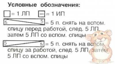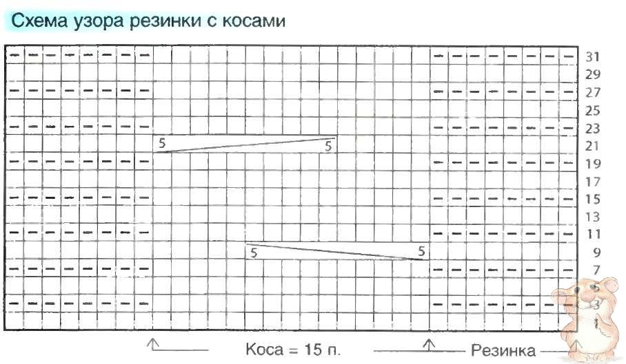 Резинка с косами: вязать по схеме. В изн. рядах петли провязывать по рисунку. Распределение петель по ширине дано в описании работы. В высоту провязать 1 раз 1-32 ряды, затем повторять узор с 9-го ряда.