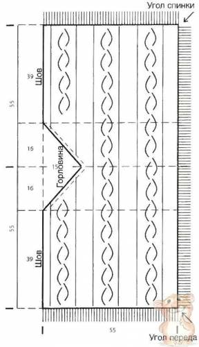 На спицы набрать 85 петель. Распределить петли следующим образом: 10 петель резинки, * 15 петель косы, 12 петель резинки *, повторить от * - * всего 2 раза, 15 петель косы, 6 петель резинки. Вязать таким образом. $CUT$На высоте 39 см от начала по левому краю выполнить убавления для выреза горловины. Для этого попеременно 1 раз в каждом ряду и 1 раз в каждом 2-м ряду провязать вместе третью от конца и предпоследнюю петли, всего 22 раза = 63 петли.