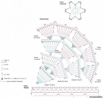 Звёздочка: пряжей белого цвета набрать цепочку из 6 ВП и замкнуть в круг СС. 1-я ряд: 3ВП подъёма, 17 ССН в получившееся кольцо. Ряд закончить СС. 2-й ряд: 6 ВП (1 ВП подъёма + 5 ВП), 3 пико, 5 ВП, * 1 СБН в 3-й ССН предыдущего ряда от крючка, 5 ВП, 3 пико, 5 ВП *. Повторить от * до * 4 раза, всего 6 раз. Ряд закончить СС.