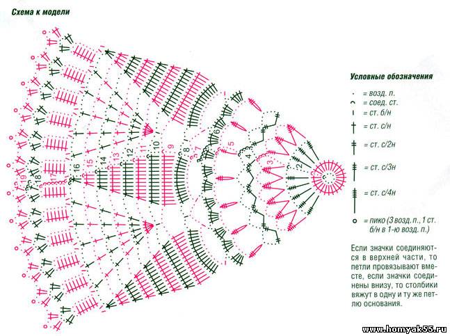 столбика с накидом (ССН), свяжите в кольцо из ВП еще 23 ССН. Продолжайте вязать по схеме, начиная каждый круговой ряд с числа указанных в ней ВП и заканчивая СС.$CUT$ При необходимости выполняйте перед началом следующего ряда необходимое число СС. В 17-м круговом ряду после соответствующего СБН свяжите 9 ВП, выполните по 1-му ССН в 4-ю - 9-ю ВП от крючка и продолжайте вязать ССН, как указано на схеме.