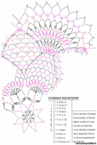 Связать цепочку из 10 ВП. и сомкнуть её 1 СС в кольцо. Далее вязать круговыми рядами по схеме. В 3-м ряду выполнять группы из разных по высоте ССН в «пико» предыдущего ряда.$CUT$ Выполнить центральную группу следующим образом: 1 СБН, 1 С2Н в 4-ю часть СБН, * 1 С3Н в 3-ю часть СБН, 1 С2Н в 1 -ю часть только что связанного С3Н, повторить от * 3 раза.