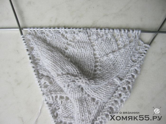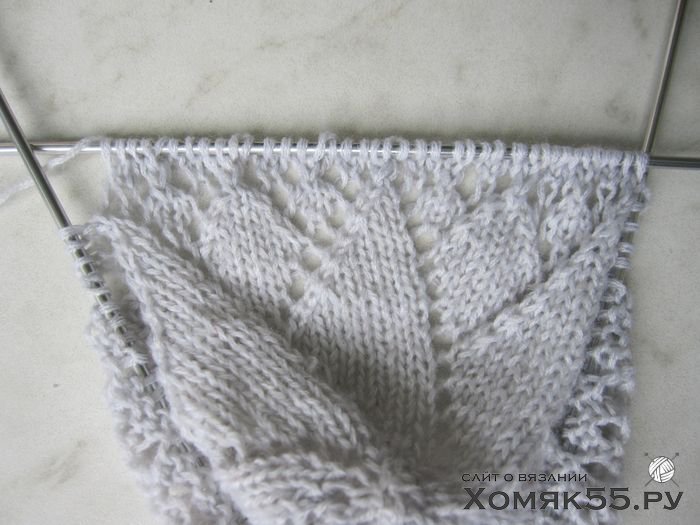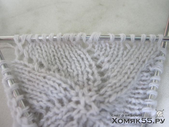 30-й ряд: * 2 п. с наклоном вправо, 1 накид, 1 лиц., 1 накид, 3 п. вместе (переставить первые две петли на левой спице таким образом, чтобы вторая стала первой и провязать 3 п. вместе лицевой), 1 накид, 1 лиц., 1 накид, 3 п. вместе, 1 накид, 1 лиц., 1 накид, 3 п. вместе, 1 накид, 1 лиц., 1 накид **.