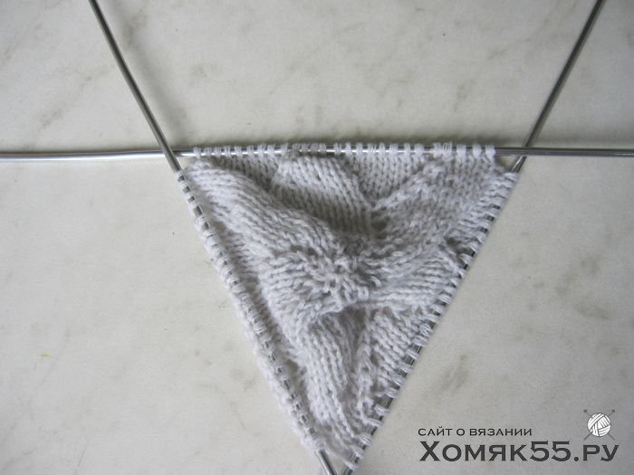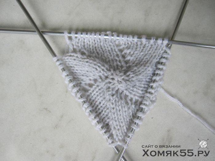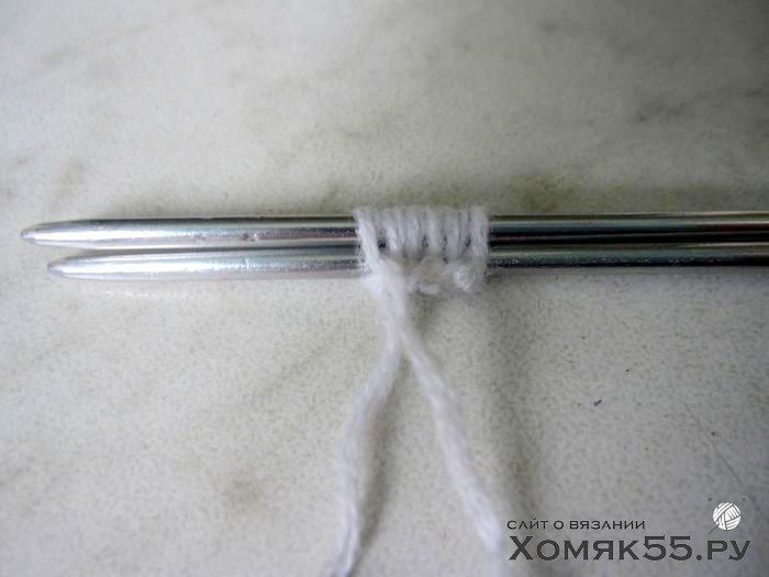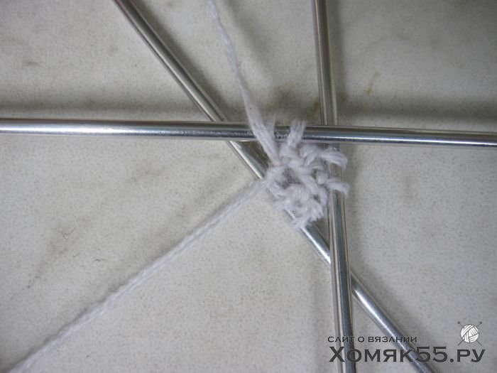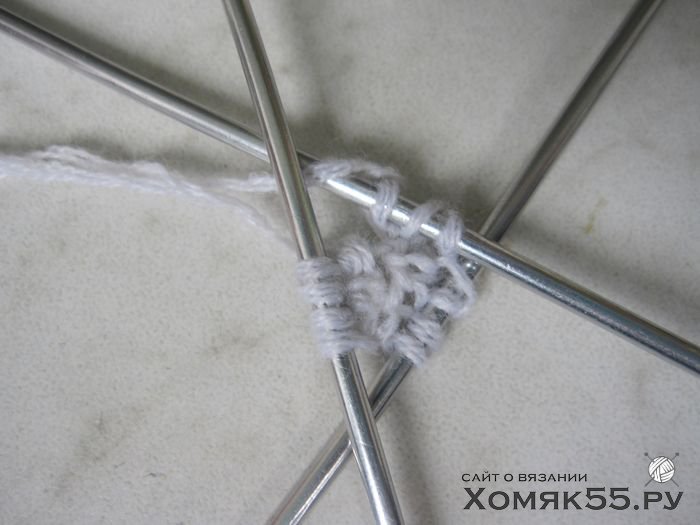 Все петли распределить на 3 спицы (по 2 п. на каждой) и замкнуть их в кольцо.