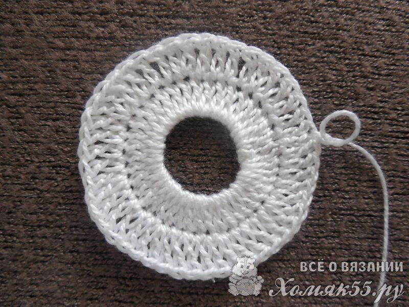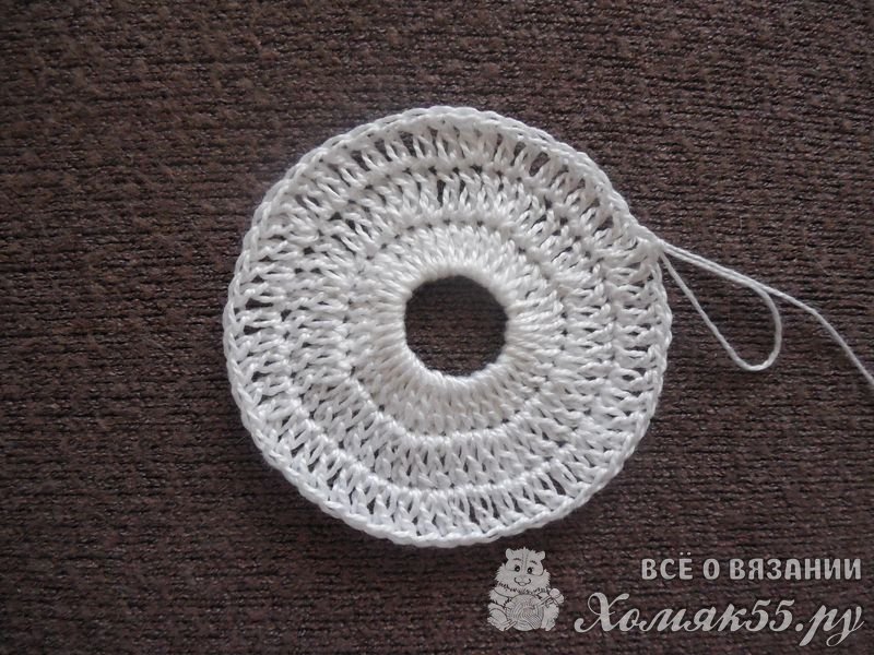 2 ряд – вяжите столбиками с накидом, удваивая каждый пятый столбик, т.е. в каждую пятую петлю основания вяжите два столбика с накидом. Получится 48 стобиков с накидом.