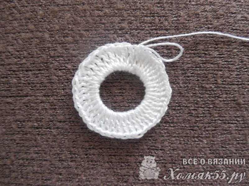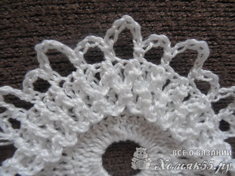Провязывайте столбики без накида этого ряда в петли основания межу арками четвертого ряда.