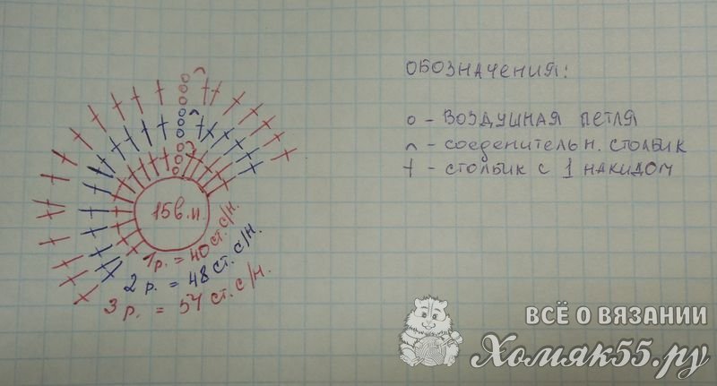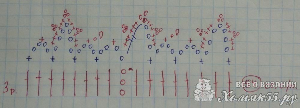 3 ряд - вяжите столбиками с накидом, удваивая каждый восьмой. В третьем ряду должно получиться 54 столбика с накидом.