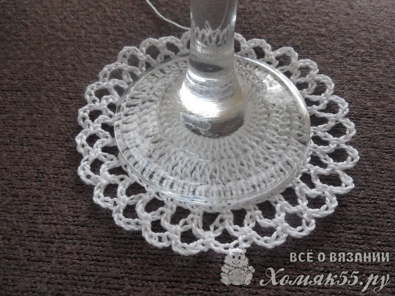 Поставьте бокал и затяните шнурок, завязав на бантик. Когда поставите бокал может показаться что основание маловато - не бойтесь, «французская» сетка – это четвертый и пятый ряды - очень эластична и все хорошо натянется.