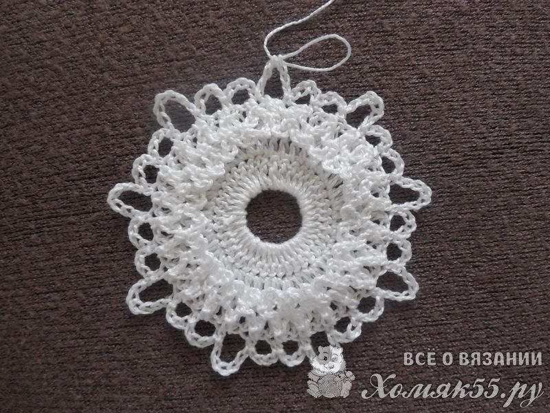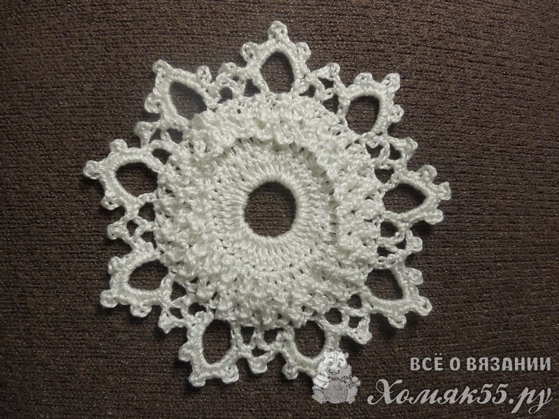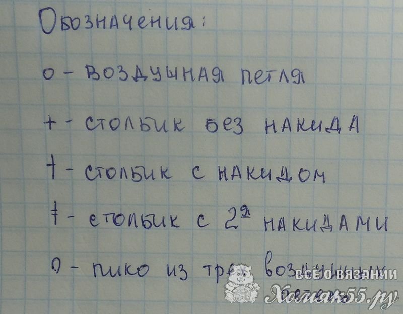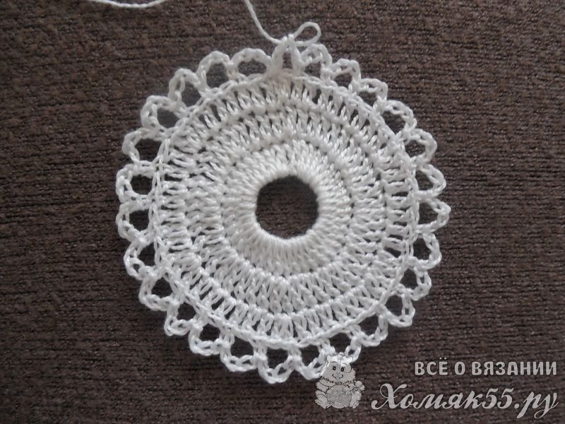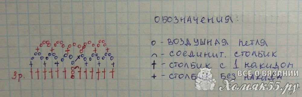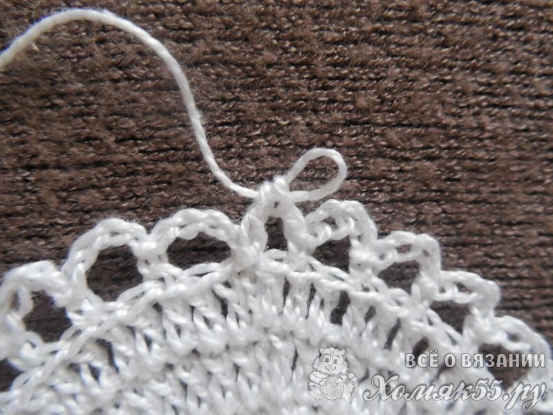 Обратите внимание на то, что последняя арка из семи воздушных петель провязана из трех воздушных петель и столбика с двумя накидами. Это позволит незаметно начать обвязку последнего ряда. Сделайте это по предыдущей схеме.