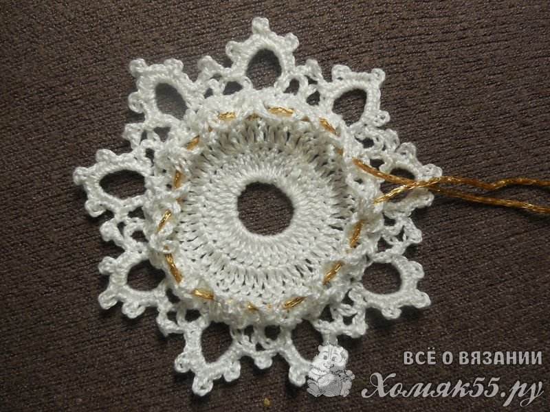 Отрежьте около 30 см шнура или тонкой атласной ленты и проденьте в арки пятого ряда как на фото.