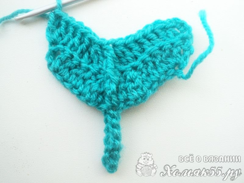 Теперь будем вязать с убавками, чтобы сузить перо. Делаем 3 ВП. Провязываем всего 1 ССН в эту же точку. Далее выполняем 3 ССН по 1 в каждую петлю, далее 3 ССН с общей вершиной. В центр так же, как и в предыдущих рядах вяжем 1 ЛРС3Н. Затем 3 ССН с обшей вершиной, 3 ССН и 2 ССН в последнюю петлю.