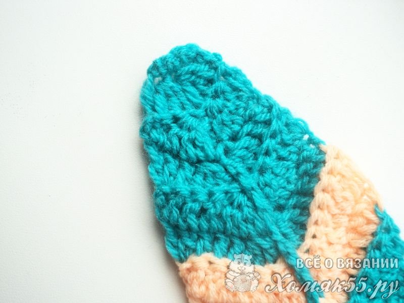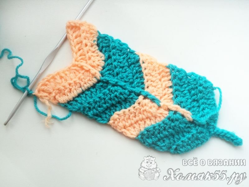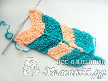 Затем выполним еще 1 ряд персиковой пряжей и сменим нить. Выполним 3 ряда голубой нитью и снова сменим нить и провяжем 2 ряда.