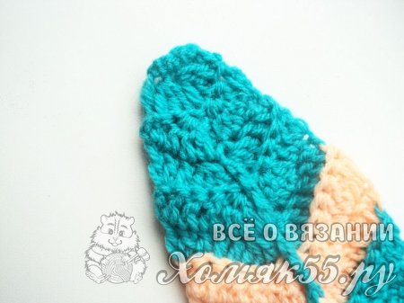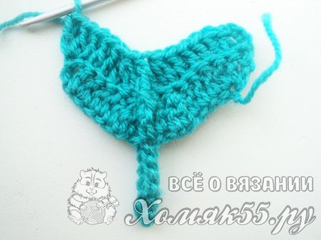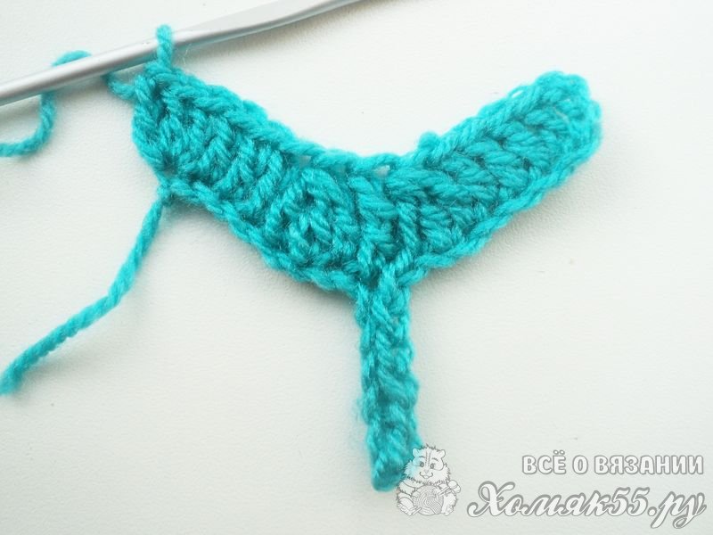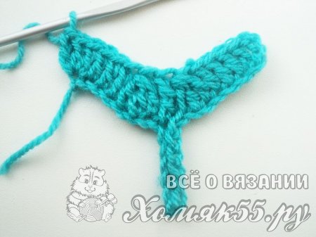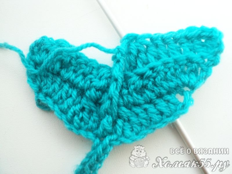 Так мы сделали заготовку. Теперь будем вязать разворотные ряды. Сделаем 3 петли подъема. Затем провяжем 1 столбик с 1 накидом (ССН) в 3-ю петлю от крючка. Сюда же выполним еще 2 ССН. Теперь свяжем 3 ССН подряд по 1 в каждую петлю. Далее в новые 3 петли выполняем 3 ССН с общей вершинкой. В центр детали вяжем 1 С2Н. Затем провязываем точно так же, но в обратном порядке. То есть вяжем 3 ССН с общей вершиной, затем 3 ССН подряд по 1 в каждую петлю. А в последнюю петельку выполняем 3 ССН.