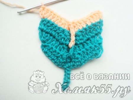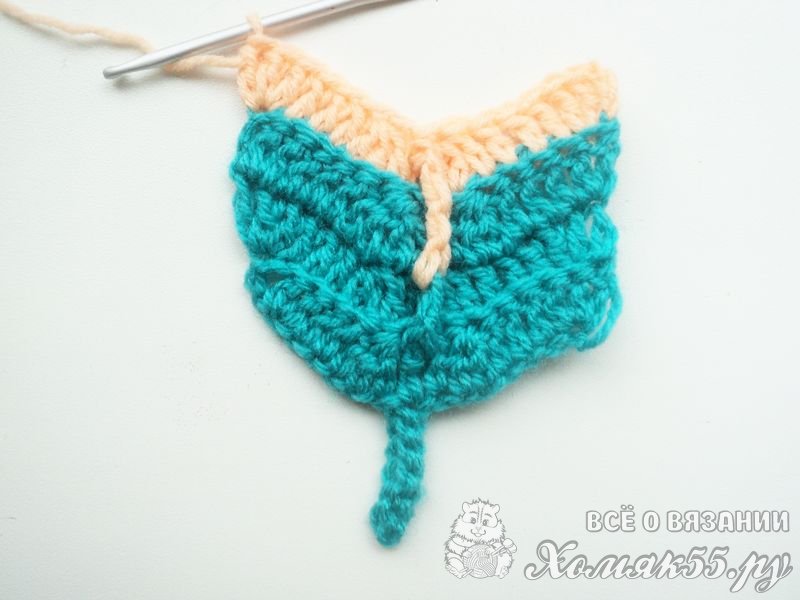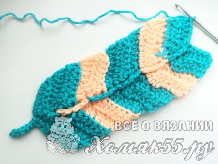 Всего нужно связать примерно 8-10 рядов, считая первый. Можно менять нить, и тогда перо будет с полосочками. Например, можно провязать 3 ряда голубой нитью, а затем сменить на персиковую и выполнить 1 ряд.