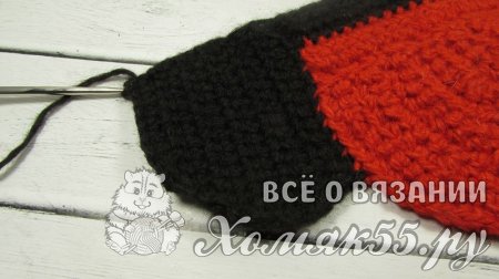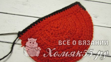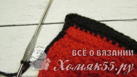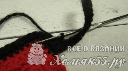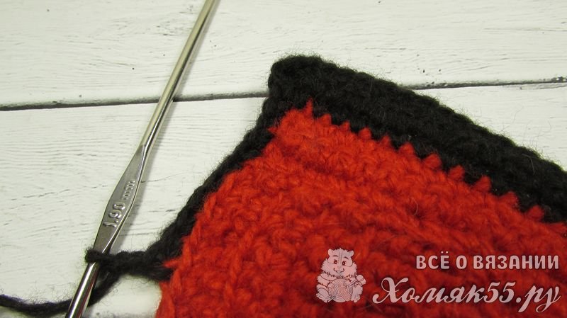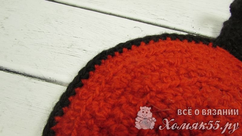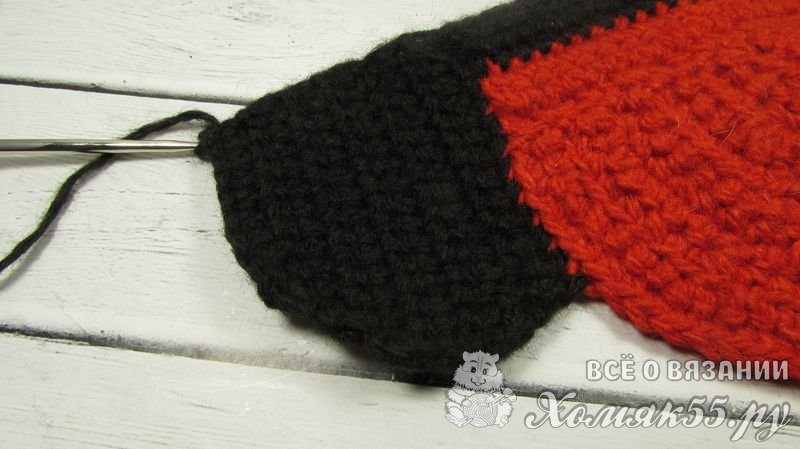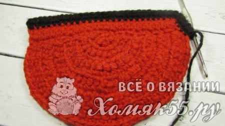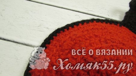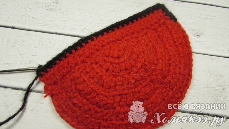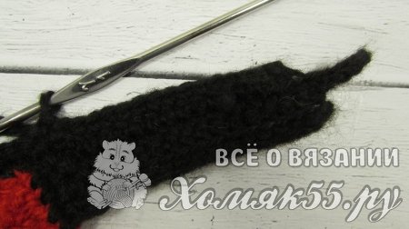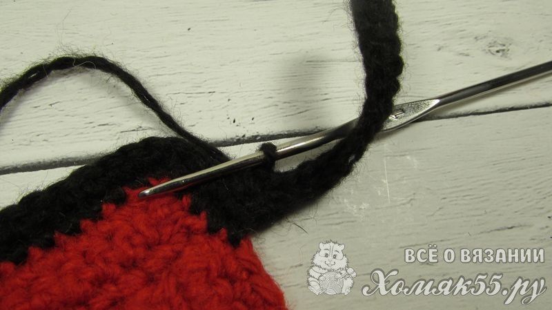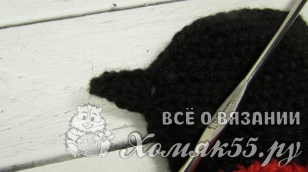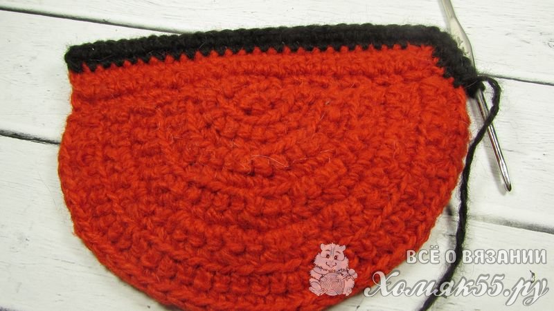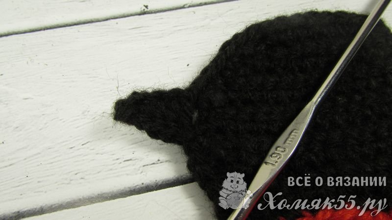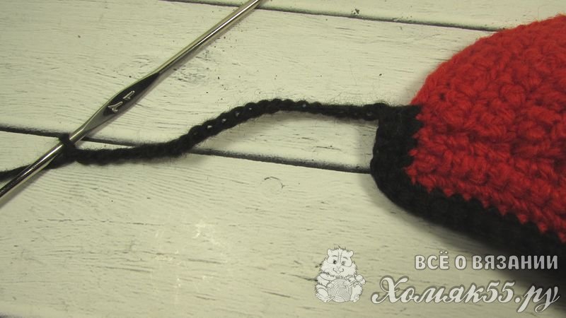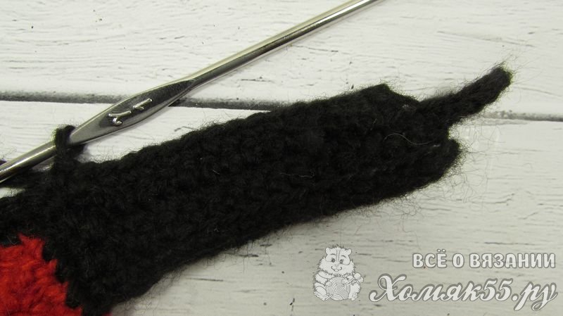 После этого берем черную пряжу и присоединяем ее к краю брюшка с ее круглой стороны, отступая от угла примерно на 5-6 петель. Провязываем 5-6 петель столбиков без накида до угла, а затем вяжем 1 воздушную петлю и продолжаем вязать столбики без накида по всему прямому краю до конца ряда.