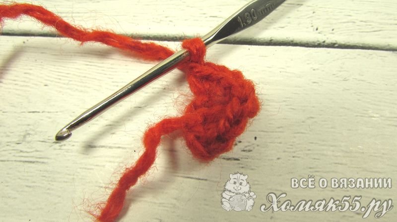 Теперь провязываем одну воздушную петлю для подъема, а затем вяжем столбики без накида до половины провязанного ранее кольца.