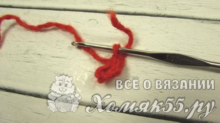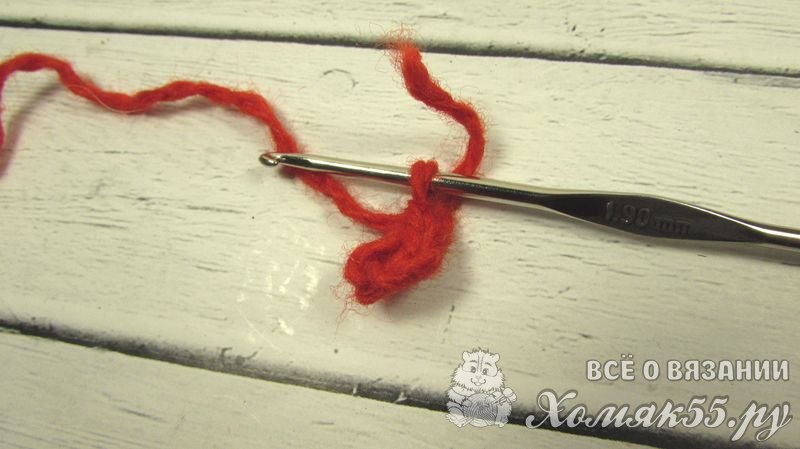 Сначала начнем вязать брюшко снегиря. Для этого из пряжи красного цвета набираем 4 воздушные петли, замыкаем их в кольцо.