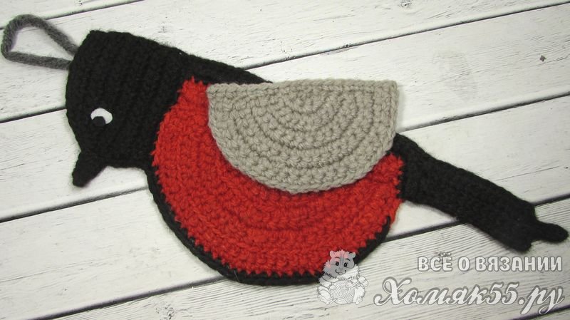 Чтобы сделать клюв, про краю головы снегиря вяжем столбики без накида, одновременно «закругляя» ее, а в ее середине вяжем 7 воздушных петель. После этого полученную цепочку обвязываем по такой схеме: 3 столбика без накида, 3 столбика с накидом, после чего прикрепляем «клюв» к голове птицы.