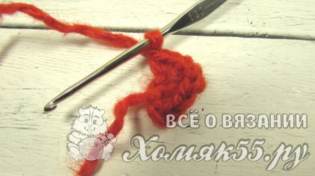 В конце ряда делаем 1 воздушную петлю для подъема, поворачиваем вязание и снова вяжем столбики без накида (2 ряд).