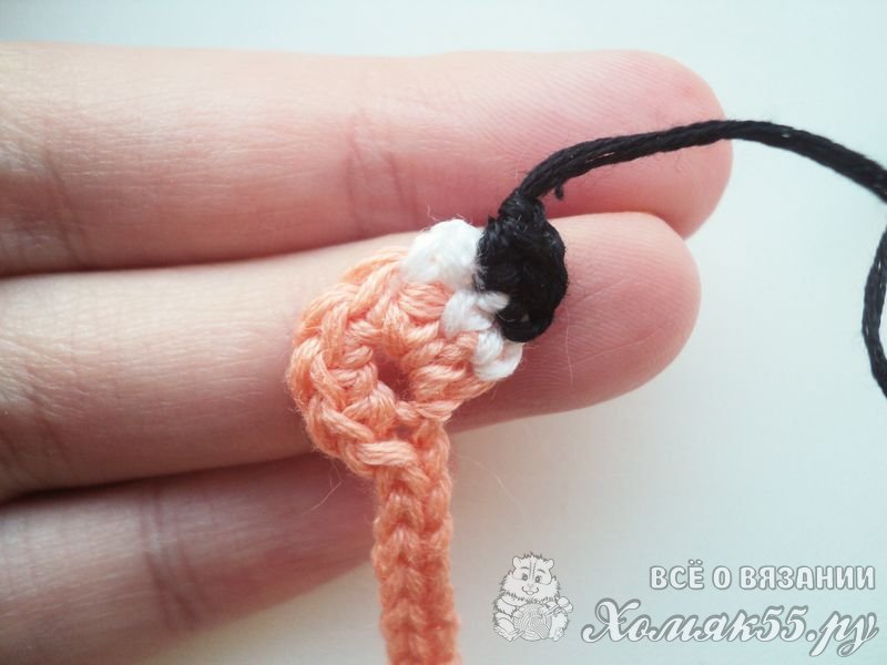 Также провязываем по белой части 3 столбика без накида черными мулине. Клюв готов.