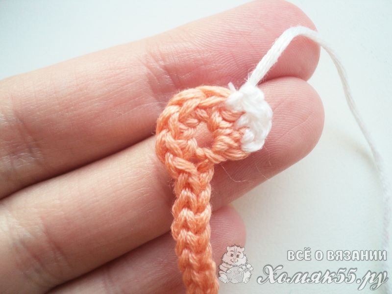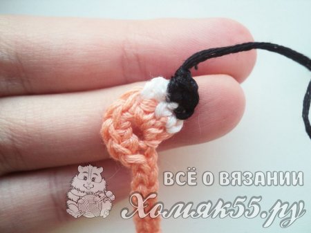 Теперь от шеи в первую петельку головы провязываем столбик без накида белыми нитками мулине. И вяжем в следующие 2 столбика еще по столбику без накида.