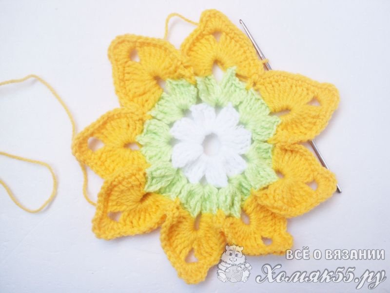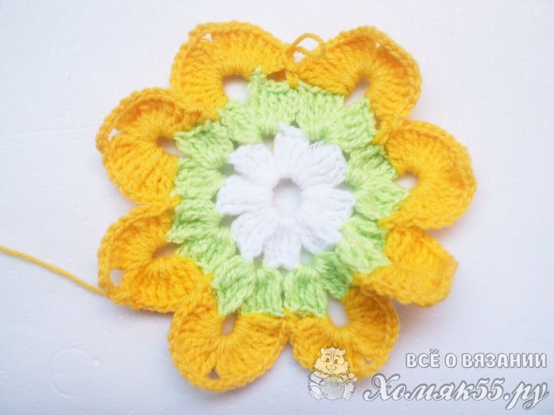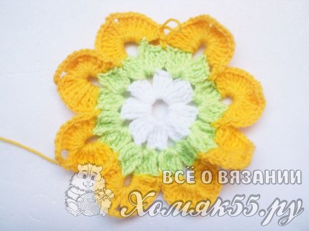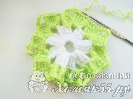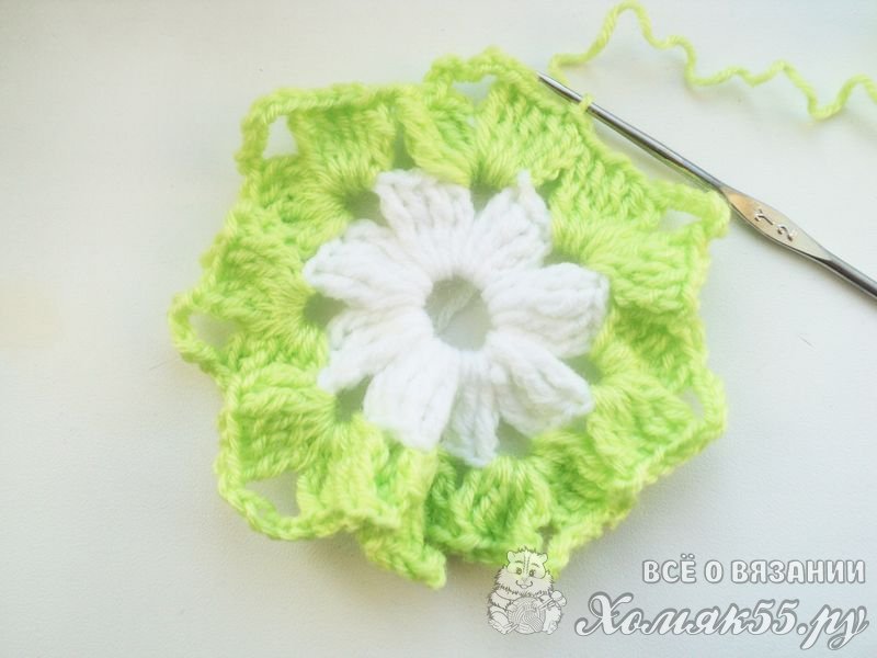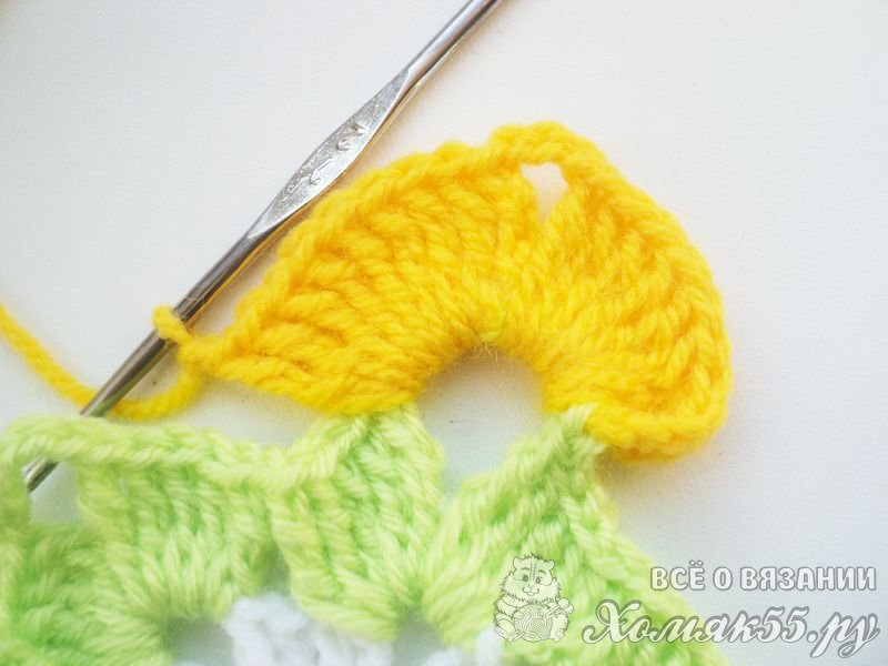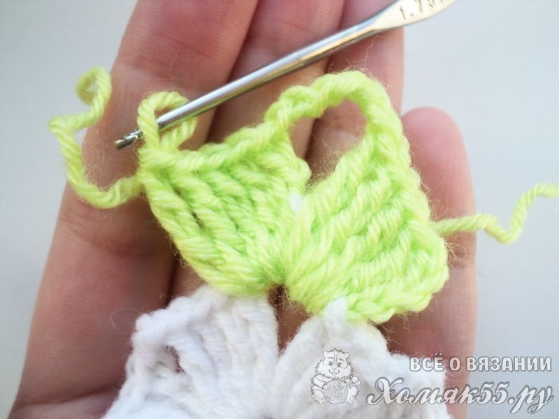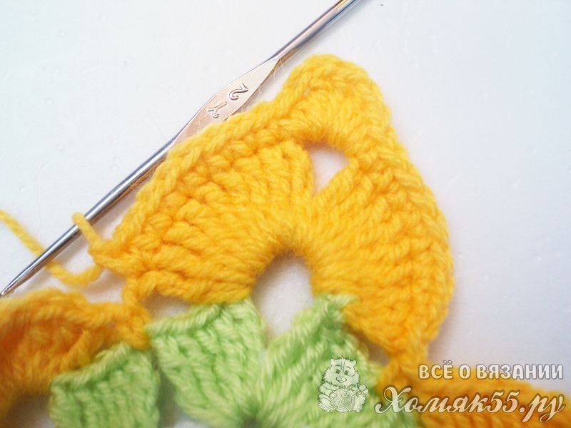 Далее сразу вяжем 5 С2Н под новую арку нижнего ряда. Далее снова 6 ВП и еще 5 С2Н. Так обвязываем все арочки.