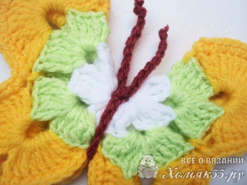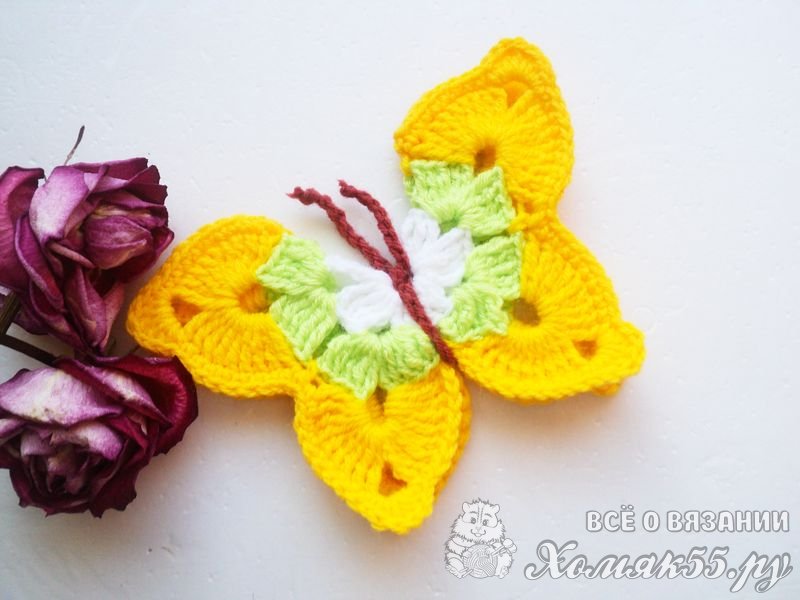 Часто для украшения вязаных изделий используют различные вязаные аппликации и цветы. В этом мастер-классе мы свяжем бабочку крючком. Вяжется она очень просто, поэтому не требует особых навыков вязания.