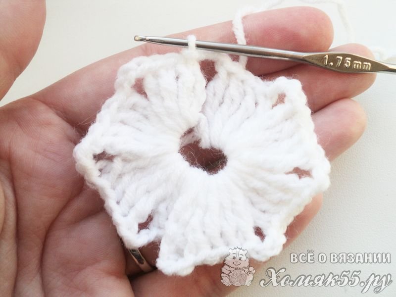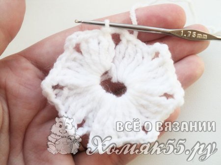 Начинаем вязать со скользящей петли. Затем делаем 4 воздушных петель (ВП), которые будем считать как 1 столбик с двумя накидами (С2Н). Теперь внутрь кольца вяжем 3 С2Н. Далее делаем 3 петли и повторяем еще 7 раз. То есть 7 раз провязываем 4 С2Н и 3 ВП. Чтобы замкнуть ряд провяжем 1 СС в 4-ю петлю подъема. Так мы должны делать в конце каждого ряда, чтобы вязание получилось ровным и аккуратным. Скользящую петлю затягиваем, но не сильно. Нужно чтобы столбики лежали ровно.