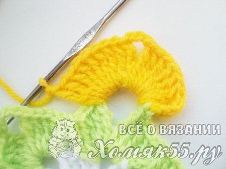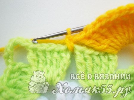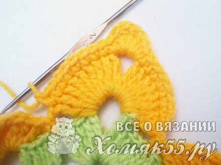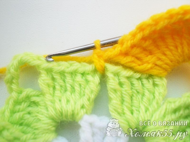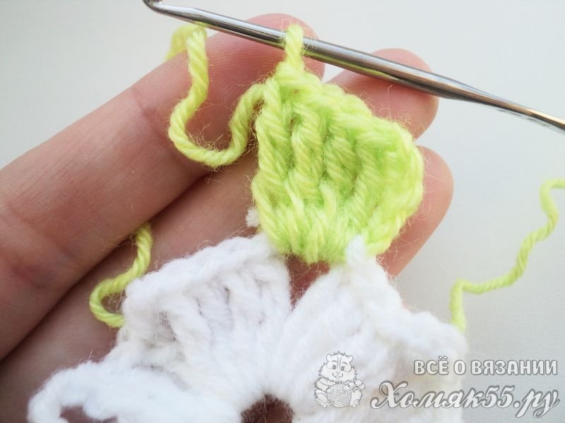 Проходим с помощью соединительного столбика (СС) под арку из 3 петель. Под арку тоже вяжем 1 СС, но провязывая его, меняем нить. Делаем 4 петли (вместо 1 С2Н) и далее вяжем еще 4 С2Н.
