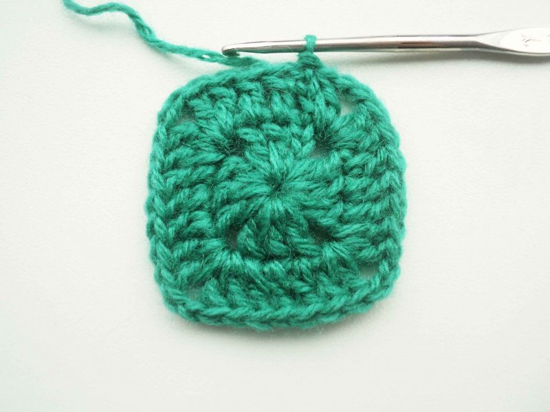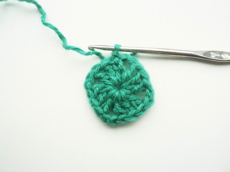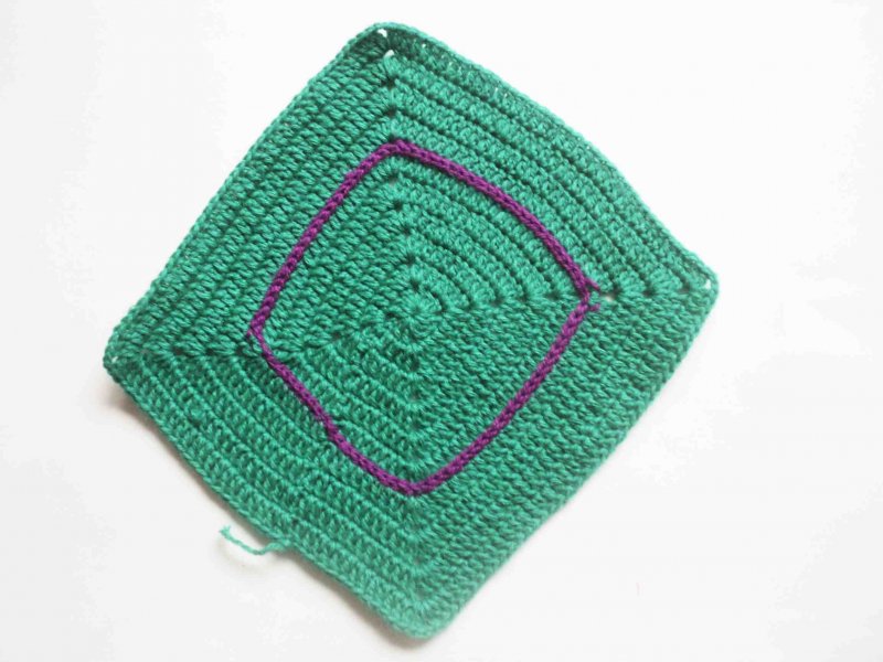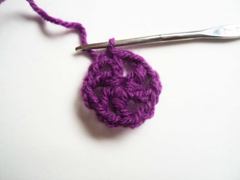 Получили начальный квадрат. Далее его нужно просто увеличивать. Для этого будем вязать по 1 ссн в каждый ссн нижнего ряда, а под каждую цепочку из 2 петель провязываем 2 ссн, 2 воздушные петли и еще 2 ссн. В конце соединяемся так же 1 соединительной петлей в 3 петлю подъема.