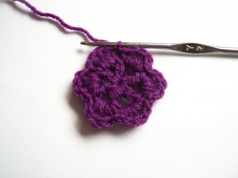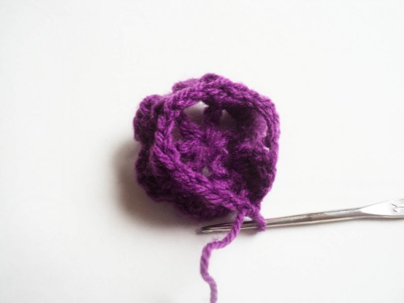 Затем прикрепим фиолетовую нить между 6 и 7 рядами. Провязываем по всему ряду соединительные столбики за ножки ссн.