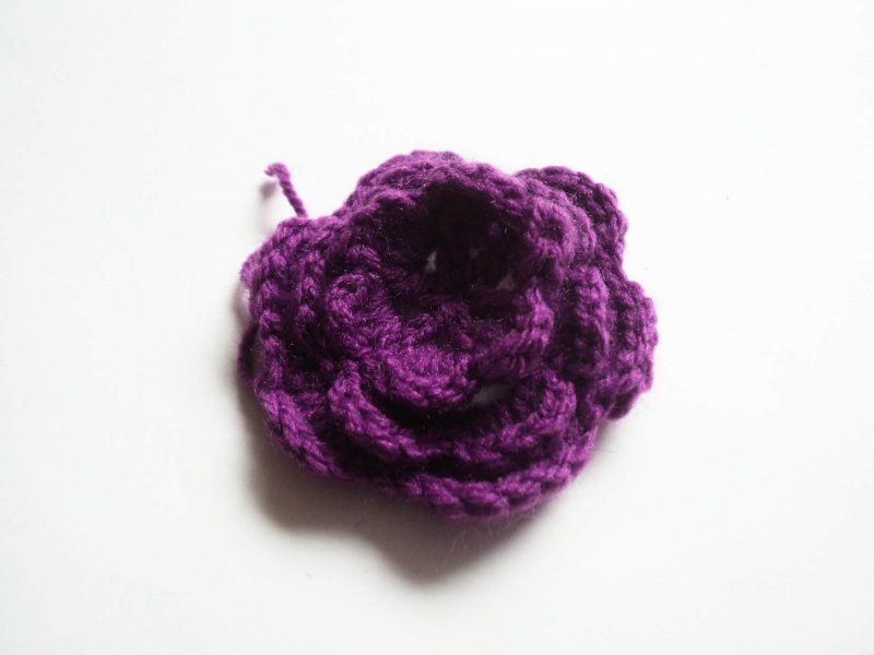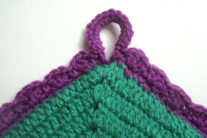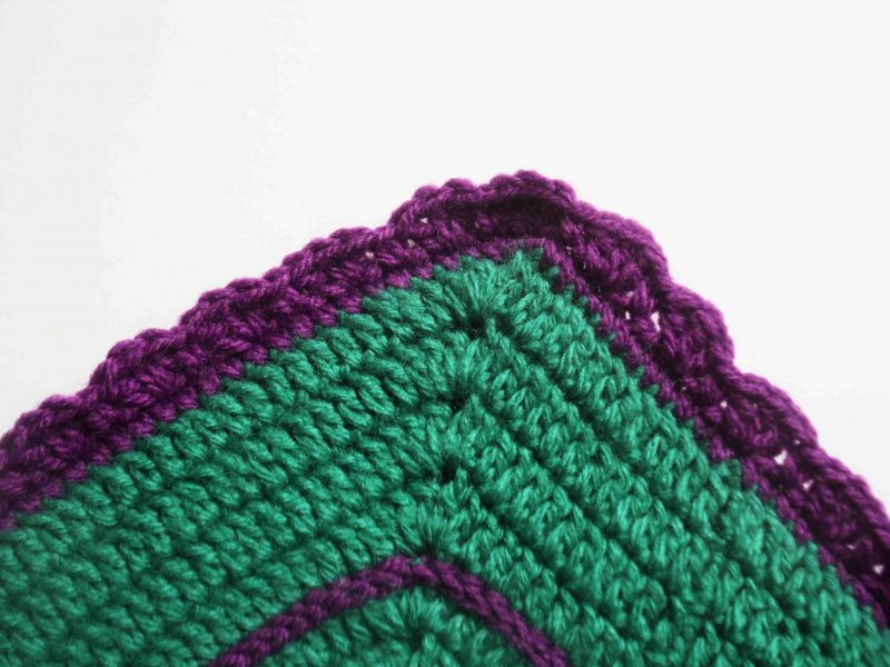 Осталось сшить 2 детали. Сшиваем фиолетовой ниткой сбн. На последнем уголке сделаем петельку. Провязываем 16 воздушных петель и присоединяем цепочку к петлям основания.
