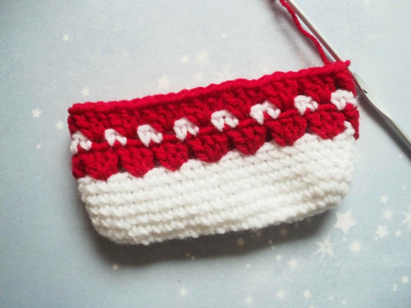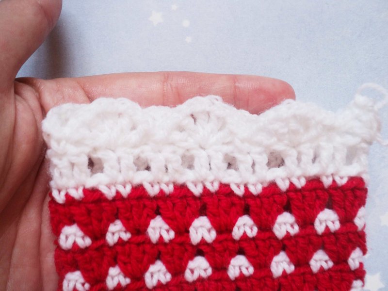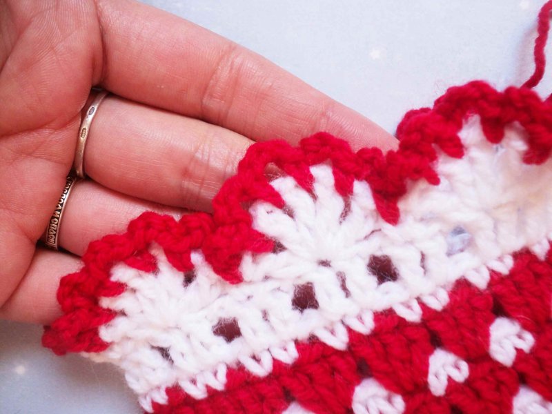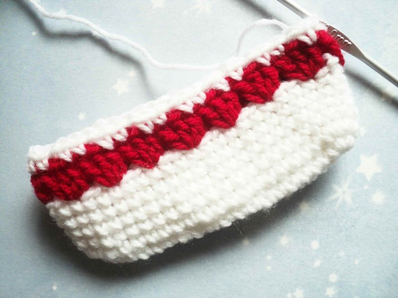 Берем красную нить. Вяжем 1 сбн под каждую вп нижнего ряда, а после каждого сбн выполняем по 3 вп.