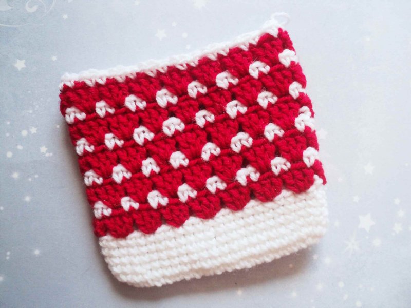 Можно изготовить такой мешочек в любом другом цвете. Но чтобы они выглядели именно новогодними, лучше выбрать красный и белый, либо синий и белый. Крючок выбираем, исходя из толщины нити. Для такого мешочка отлично подойдет «Детская новинка» или «Ярн Арт Джинс».