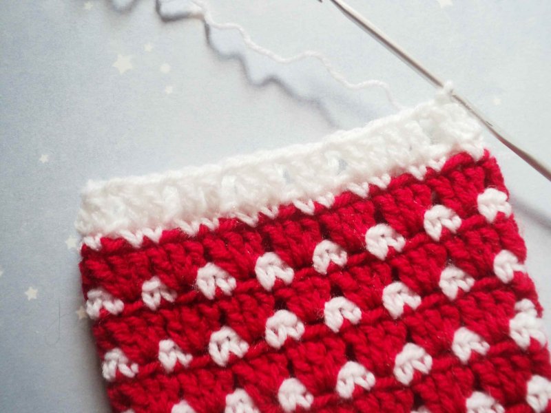 И вяжем еще 5 рядов без прибавок.Затем берем красную нить и переходим к вязанию основного узора. Делаем 3 петли вместо самого первого ссн. Сюда же провязываем 2 ссн. Будем считать, что связали 3 ссн с общим основанием. Пропускаем 2 петли и опять вяжем 3 ссн в одну петлю.