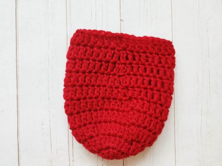 Это пятка. Ее складываем вниз и сшиваем, а потом выворачиваем. Нитку не обрезаем. Вяжем по кругу вверх 7 рядов.
