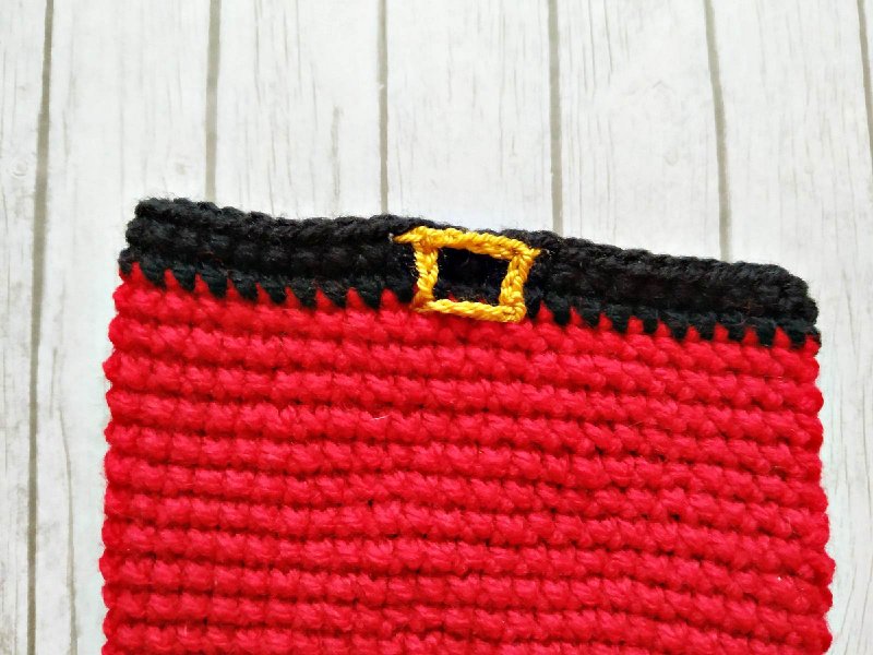 Теперь тонкой ниткой «Рукодельная» золотистого цвета будем вышивать бляшку на ремне. Присоединим в ряд, где красная нить переходит в черную и провяжем 4 петли. Затем выполним соединительный столбик за ножку петли сверху. Далее снова сделаем 4 петли и теперь выполним 1 соединительный столбик за ножку петли, отводя крючок вправо. Далее опять 4 петли и 1 соединительный столбик вниз, а затем 4 петли и соединительный столбик влево. То есть делаем квадрат из воздушных цепочек из 4 петель.