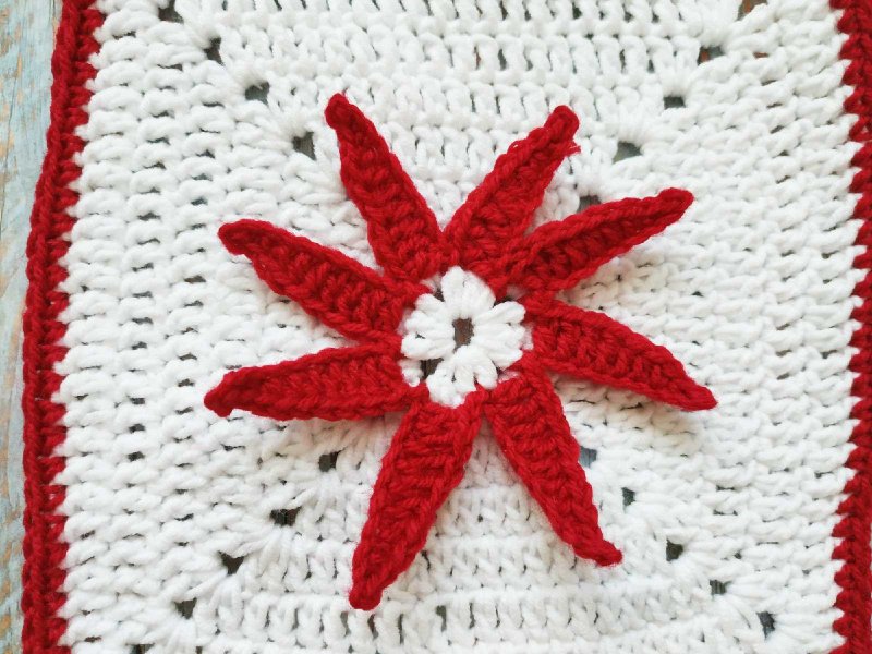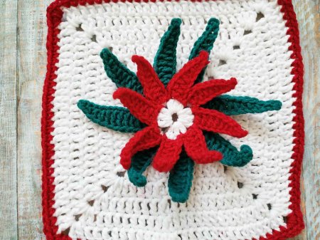 Теперь будем вывязывать лепесточки пуансеттии. Присоединяем красную нить в вершинку стсн первого ряда. Вяжем 10 вп. Затем спускаемся по петлям вниз. Вяжем 1 сст, 2 сбн, 3 пссн, а далее довязываем стсн. И присоединяем сст в вершинку следующего стсн самого первого ряда.