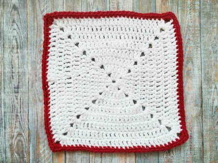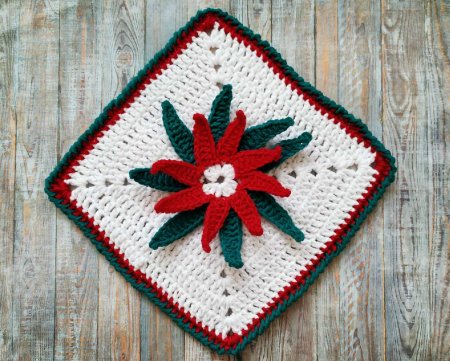 Прихватка в рождественском стиле крючком готова! Можно связать еще 1 белый квадрат и пришить его сзади, чтобы прихватка была более плотной. В этом случаем обвязку нужно делать после сшивания деталей.