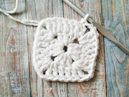 Сначала нам нужно связать обычный квадрат белой ниткой. Выполняем скользящую петлю, затем вяжем 3 петли, 2 стсн, 2 вп, 3 стсн. Затем еще 2 раза провязываем 3 стсн и 2 вп между ними.