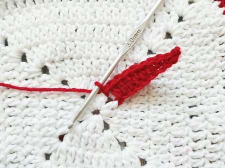 Затем сменим нить на красную и обвяжем сбн. В уголки вяжем почти так же, как и вязали. Делаем 2 сбн, 2 вп и еще 2 сбн.