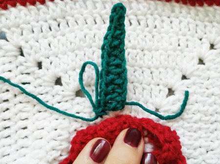 Теперь под красными нужно связать зеленые листья. Берем зеленую нить и прикрепляем ее в любой стсн под красным лепестком. Прикрепляем крючок в основания стсн второго ряда. Затем вяжем 12 вп. И все то же самое, что и при вязании лепестков цветка.