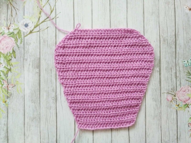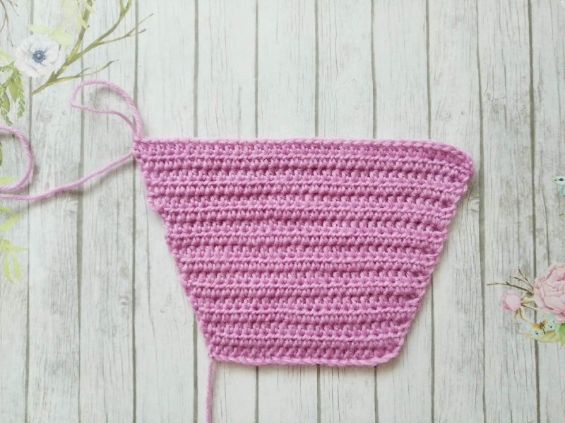 Вяжем еще 3 ряда без прибавок. И приступаем к убавкам. Делаем их в 1 и крайнюю петельки ряда, провязывая по 2 ПСт СН вместе.