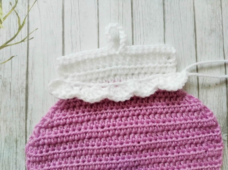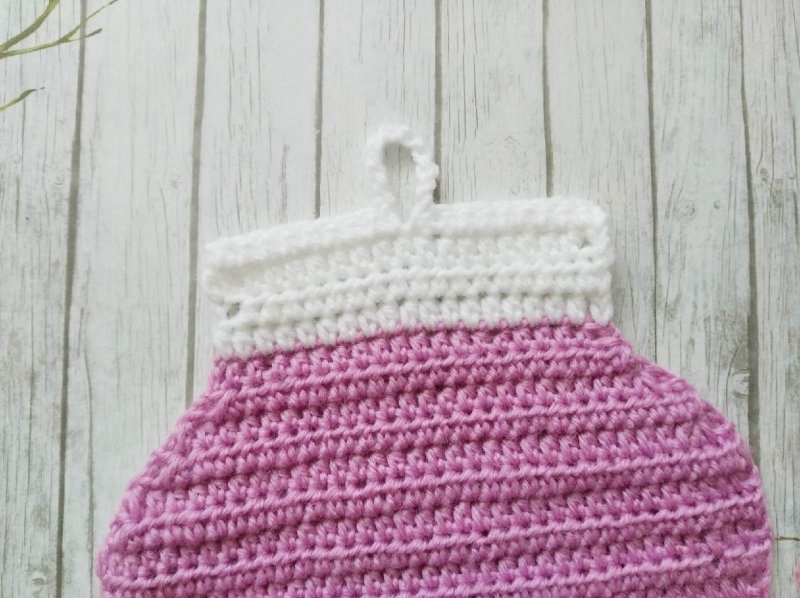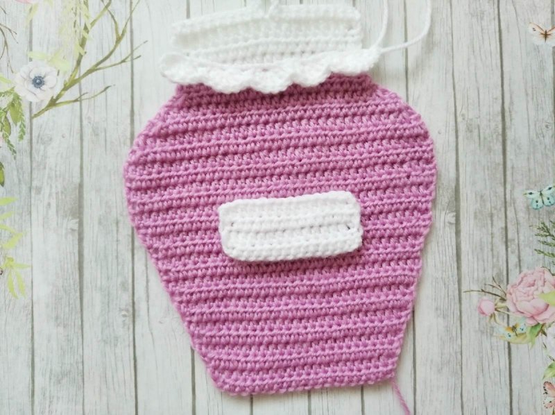 Вяжем 1 ряд без убавок. Присоединяем белую пряжу и вяжем 3 ряда ПСт СН. Вяжем далее 1 ряд Ст БН. Провязываем 10 столбиков, набираем 10 ВП и вяжем еще 10 столбиков.