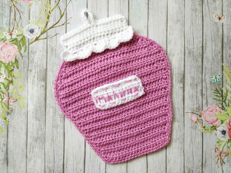Мы будем вязать прихватку баночку малинового варенья, но если сменить розовый цвет на другой, то можно связать и банку варенья с любым другим «вкусом».
