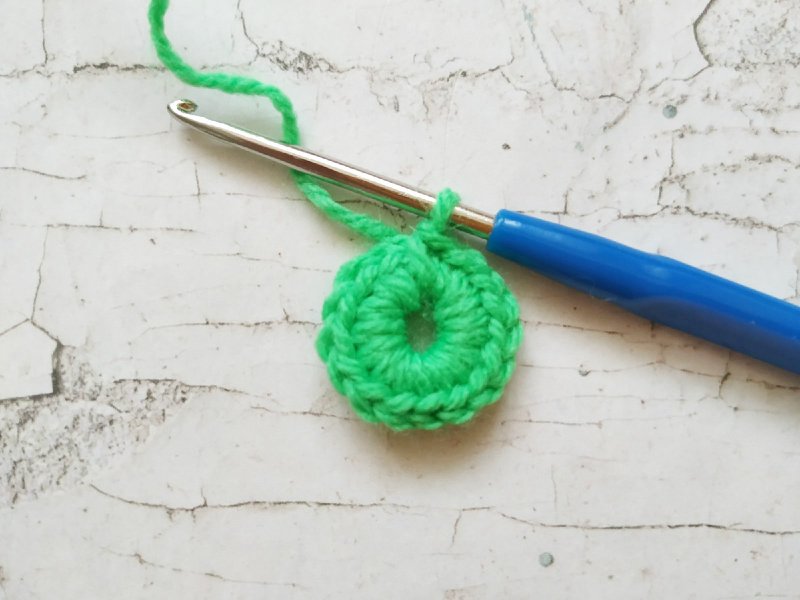 Для того чтобы начать вязание, набираем 6 петель и замыкаем их в кольцо, выполнив 1 с\ст. В новом ряду провязываем 18 ст\б\н в получившееся кольцо.
